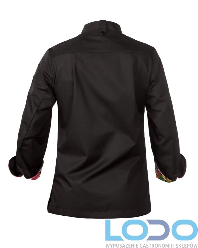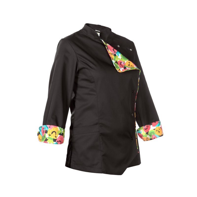 Elegancka bluza kucharska uszyta, zaprojektowana dla każdej szefowej kuchni ceniącej sobie niepowtarzalność i nowoczesny design. Bluza w kolorze czarnym delikatnie podkreślająca swoją wyjątkowość kontrastową wypustką oraz zaokrąglonymi mankietami w jasnym kolorze (wzór przedstawiający owoce). Tkanina Kb Textil, z której bluza jest uszyta, gwarantuję zachowanie koloru po wielokrotnym praniu, odporność na większe zabrudzenia i wytrzymałość na długie lata. Wygodę i bezpieczeństwo zapewnia technologia wykorzystana podczas produkcji. Dodatkowo bluzę wyróżniają cięcia modelujące z przodu doskonale podkreślające sylwetkę i praktyczna kieszeń na rękawie z przegródkami.