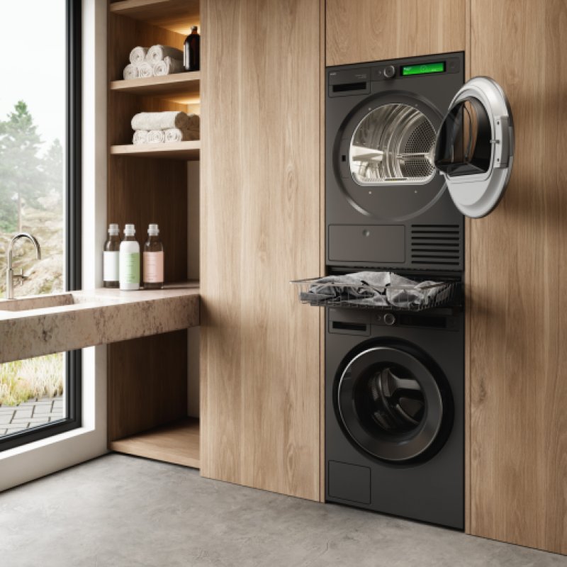 Praktyczny, wysuwany kosz stworzony do zabudowy pomiędzy pralką a suszarką, umieszczony na optymalnej wysokości ułatwiającej codzienne użytkowanie. To praktyczne rozwiązanie z linii Hidden Helpers, obejmującej akcesoria i moduły do przechowywania, które harmonijnie łączą się z urządzeniami pralniczymi ASKO, tworząc funkcjonalną i uporządkowaną strefę prania.