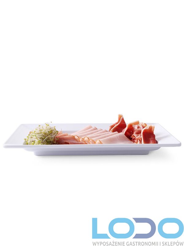 Półmisek prostokątny w kolorze białym do prezentacji wyrobów garmażeryjnych.