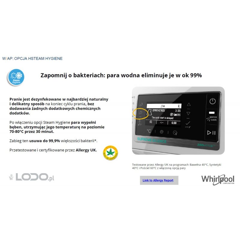 Pranie jest dezynfekowane w najbardziej naturalny i delikatny sposób na koniec cyklu prania - nawet przy praniu w niskich temperaturach - bez dodatków chemicznych. Idealny dla osób o wrażliwej skórze, a także przyjazny dla środowiska, ten zabieg usuwa do 99,9% najczęstszych bakterii.