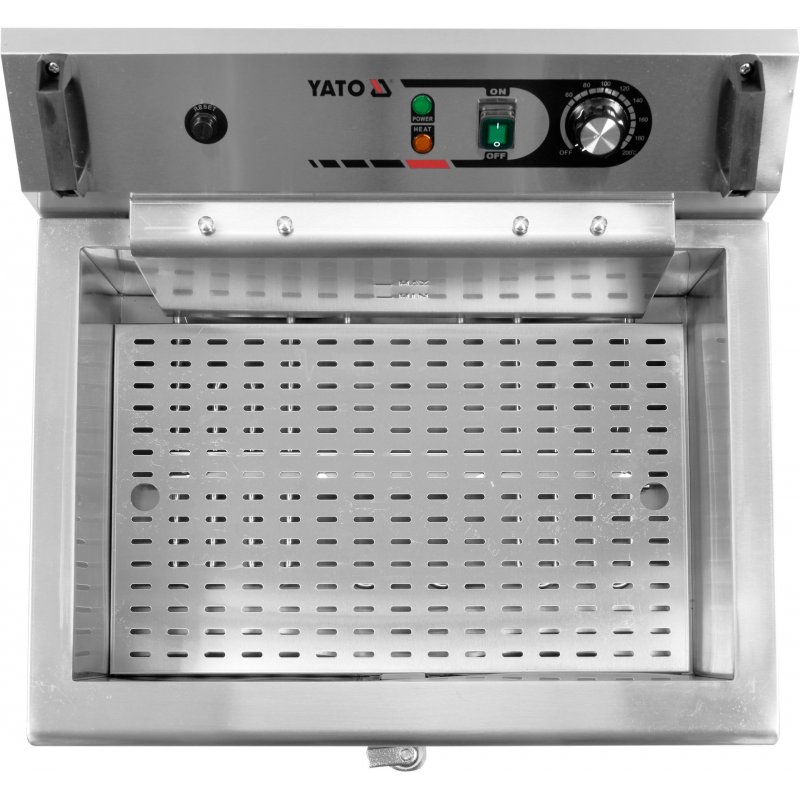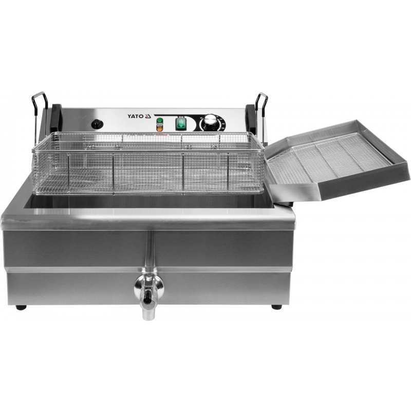 Smażalnik YATO posiada bardzo wytrzymały kosz o wymiarze 490x280x100mm z bocznymi uchwytami. Natomiast specjalne zaczepy umożliwiają powieszenie kosza bezpośrednio nad zbiornikiem, minimalizując ryzyko zachlapania olejem blatu roboczego. Dzięki temu znacznie zwiększa się czystość stanowiska pracy i minimalizuje czas potrzebny na czyszczenie. Dodatkowo smażalnik posiada boczny ociekacz, na którym można odstawić do ostygnięcia i ocieknięcia usmażone produkty.