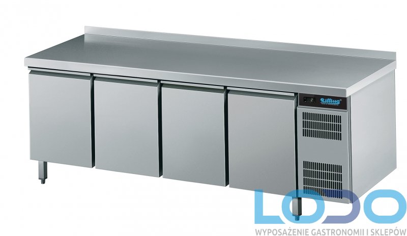 4-drzwiowy stół chłodniczy dla GN 1/1, blat z rantem tylnym h=50 mm (typ C), parownik umieszczony na górze wewnątrz urządzenia, wymuszony obieg powietrza, automatyczne odszranianie i odparowanie kondensatu za pomocą gorącego gazu, elektroniczny sterownik, hignieniczne wykonanie. Gotowy do podłączenia.