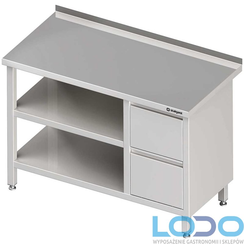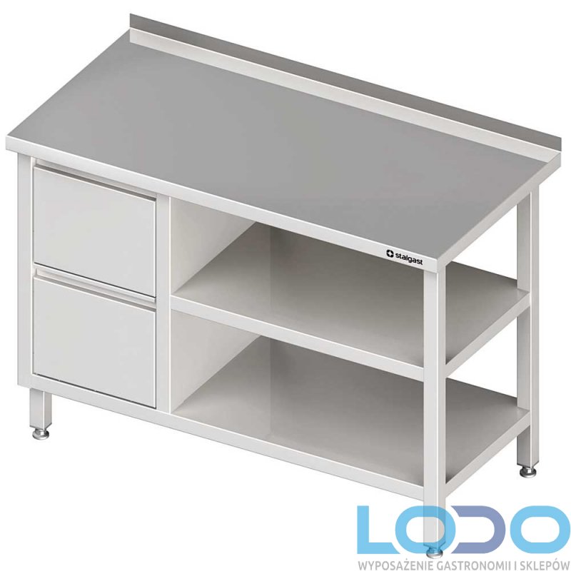 STÓŁ PRZYŚCIENNY Z BLOKIEM DWÓCH SZUFLAD I DWIEMA PÓŁKAMI STALGAST 800/600/850mm