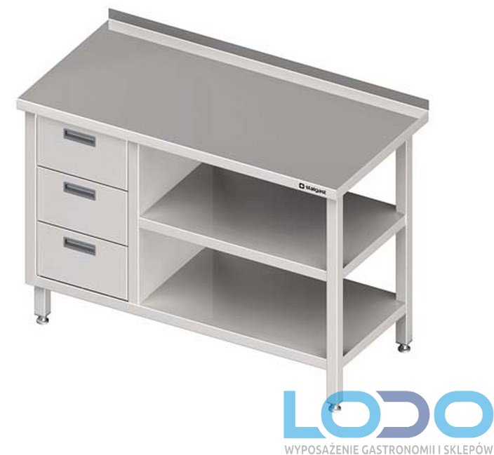 STÓŁ PRZYŚCIENNY Z BLOKIEM TRZECH SZUFLAD I DWIEMA PÓŁKAMI STALGAST 800/700/850mm