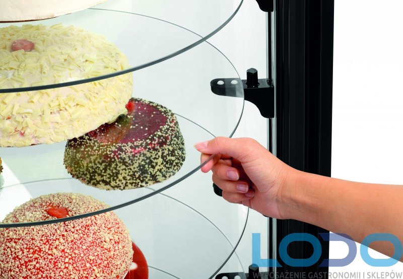 Sześć stabilnych szyb szklanych o średnicy 530 mm i grubości 5 mm oferuje wyjątkowo dużo miejsca, aby efektownie zaprezentować torty, ciasta lub przekąski.