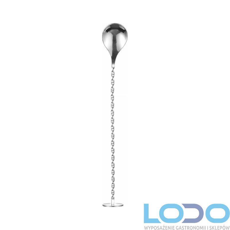 - Spiralna łyżka barmańska o długości 27 cm i pojemności 5 ml z muddlerem (końcówka w kształcie dysku): do szybkiego mieszania drinków z lodem bez rozwadniania ich, do wlewania napojów gazowanych bez spieniania oraz tworzenia warstwowych koktajli.